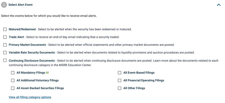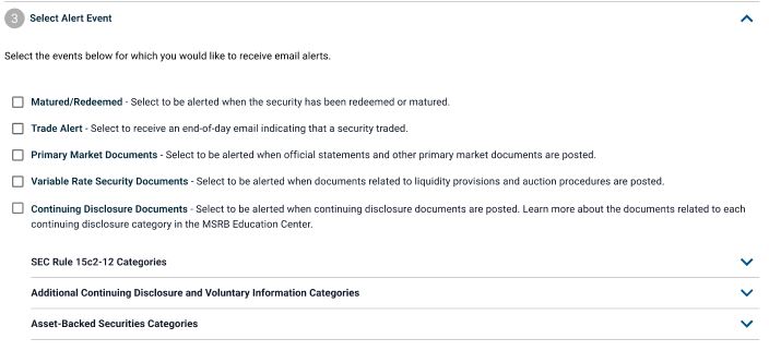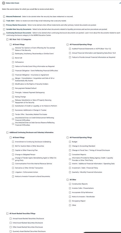 The MSRB had begun a system modernization project two years prior with a slated beta in January 2025 and go-live in October 2025. This project involved a complete redesign of the organization's main web product EMMA including the process for creating an email alert for certain actions against an individual security or, newly added, a group of securities from one or more issuers (e.g. a city). These alerts are widely leveraged by a large percentage of users to keep track of various updates and regulator-required information.