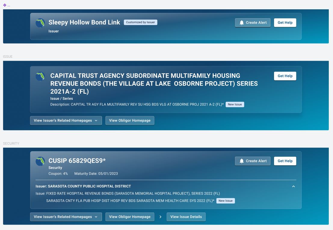The ISSUER homepage, ISSUE details page, and SECURITY details page were all generated from the same base template.
